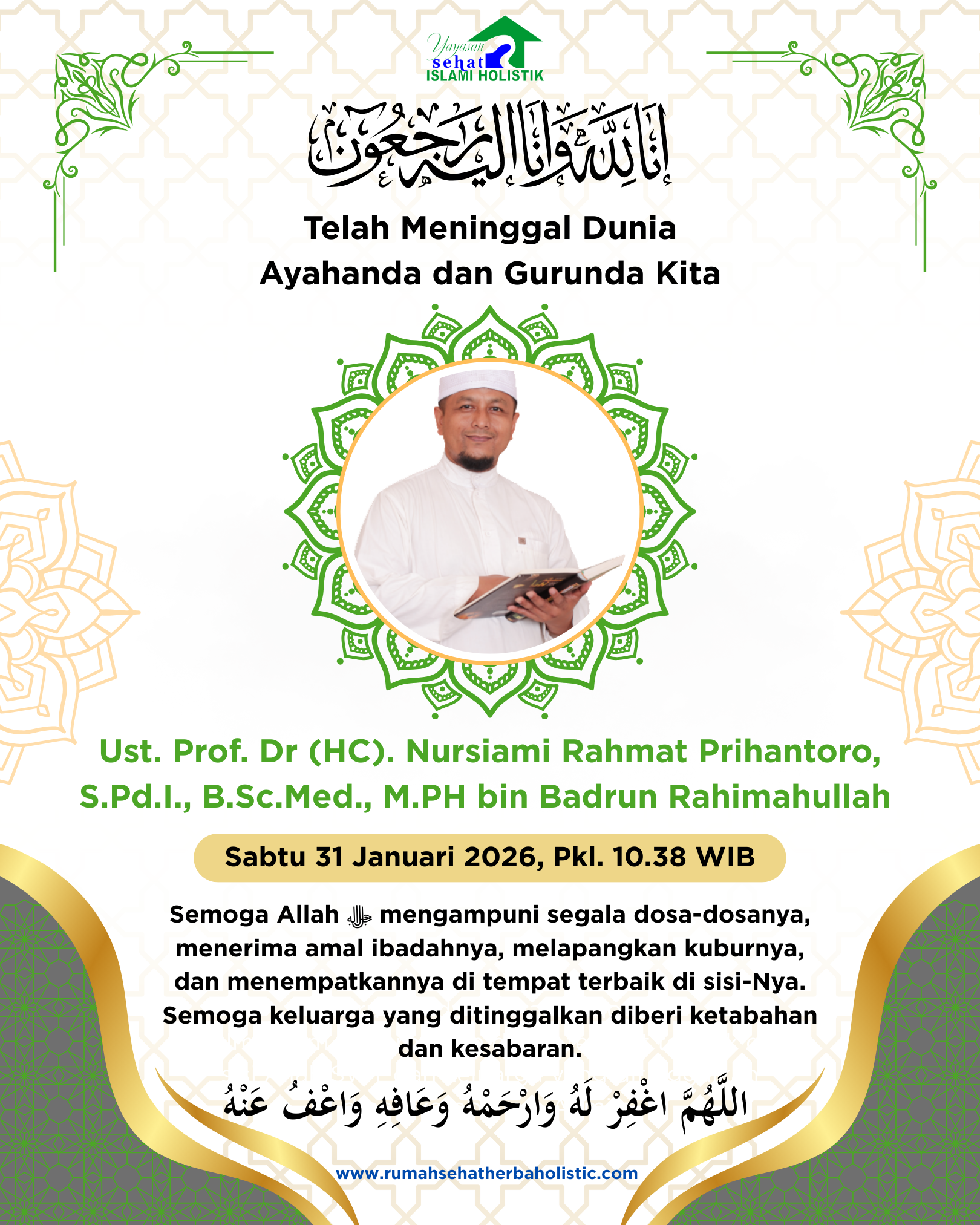 Telah meninggal dunia Ayahanda dan Gurunda Kita Prof. Dr (HC) Nursiami Rahmat Prihantoro, S.Pd.I., B.Sc.Med., M.PH bin Badrun rahimahullah