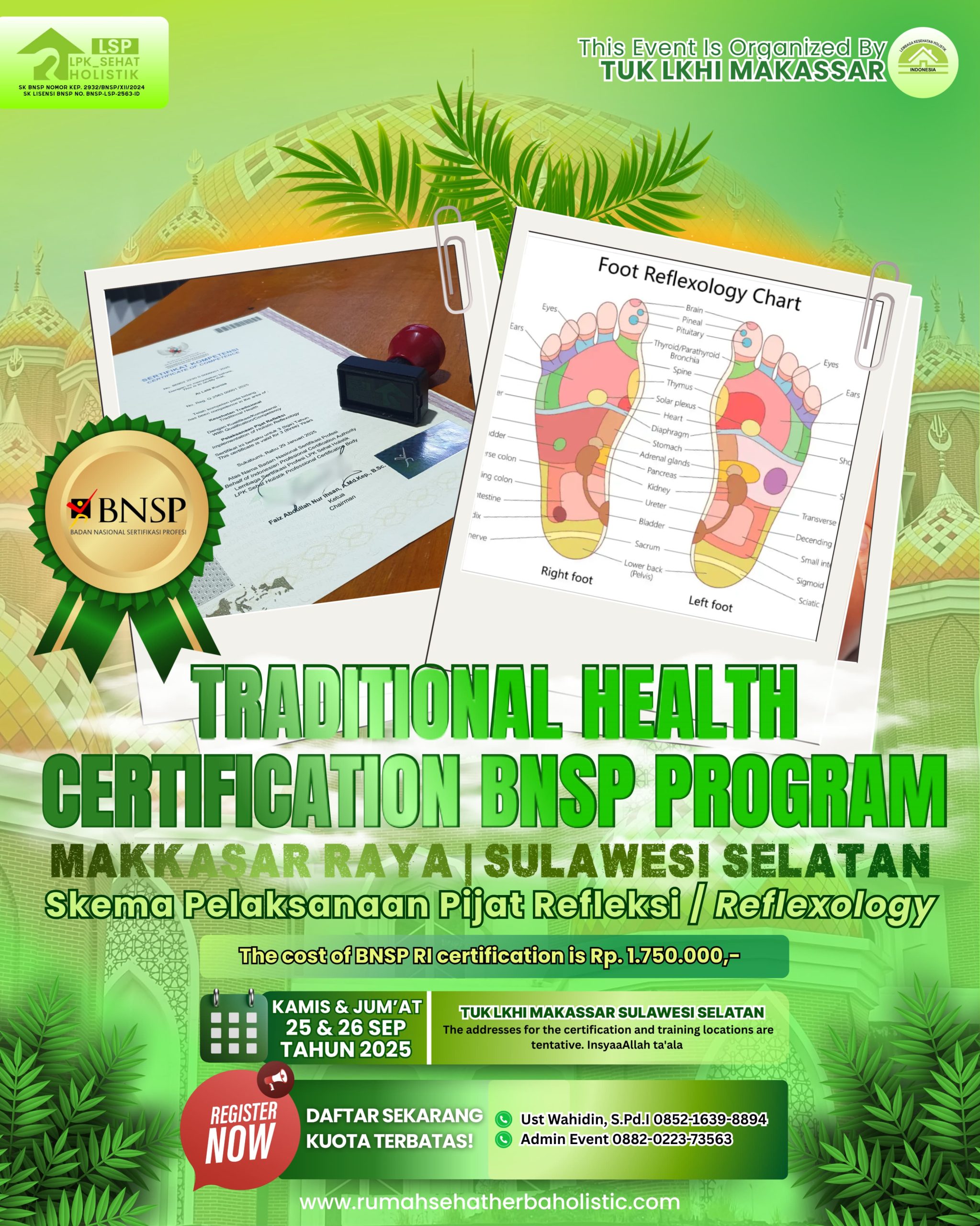 #SertifikasiBNSP #PijatRefleksiMakassar #ReflexologyIndonesia #KesehatanTradisional #MakassarTraining #BNSPRefleksi #LSPSehatHolistik #TUKLKHI #ProfesiKompeten #KompetenBersamaBNSP #TrainingSulawesi #HolistikIndonesia #RumahSehatHolistik